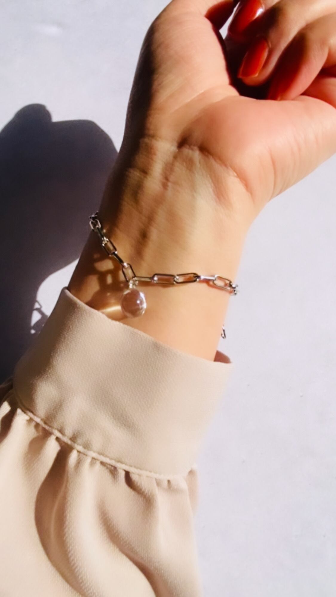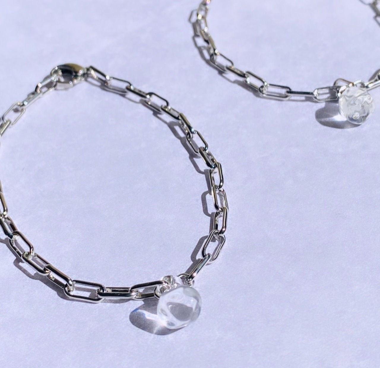 透明感のあるガラスブレスレット。手元を華やかに彩ります。ガラスの繊細な色合いや模様が、光とともに美しく輝きます。誰でも気軽に楽しめるデザインで、様々なスタイルに合わせることができます。また、ガラスならではの上品さを演出してくれます。