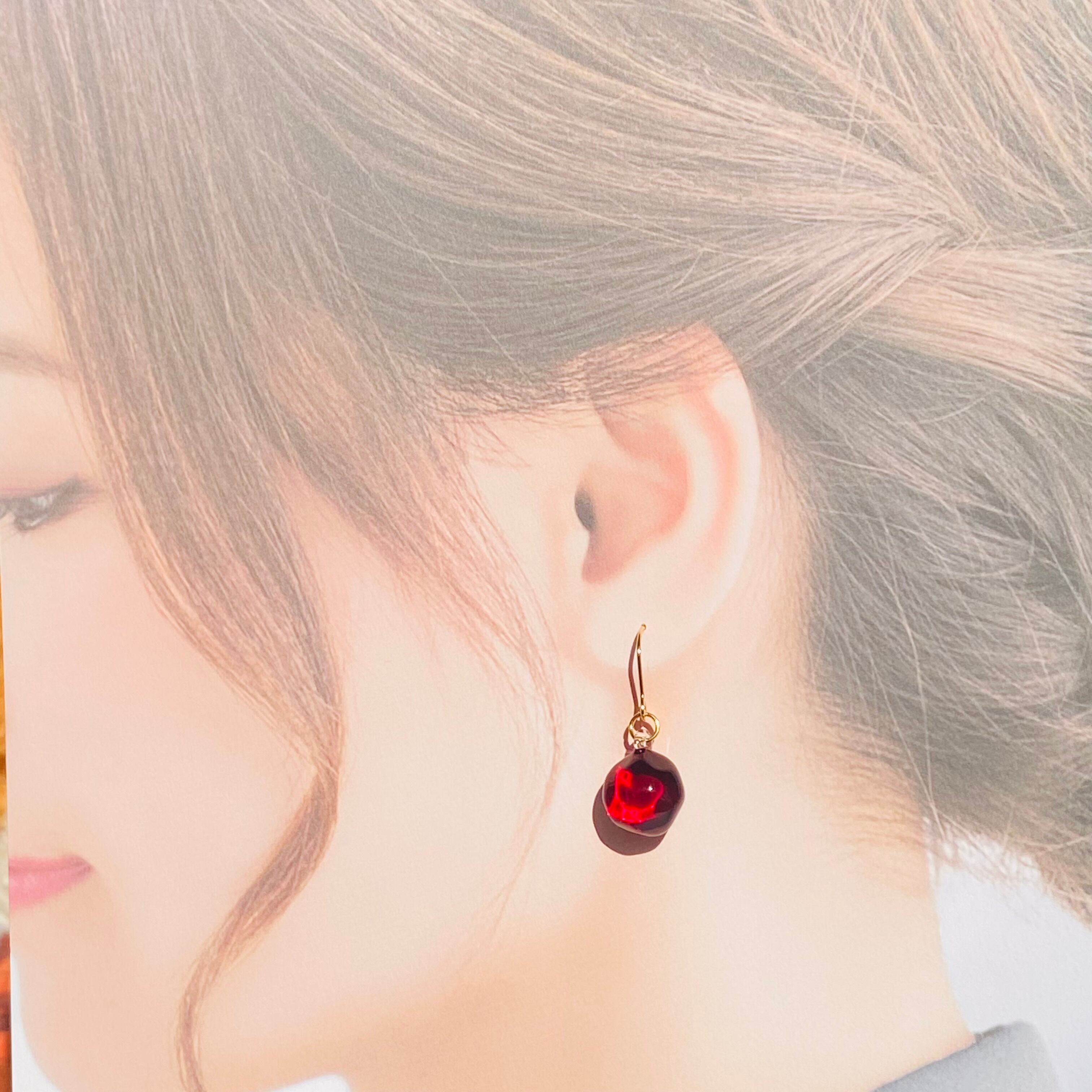 シンプルで上品なガラスアクセサリー。丸い赤のガラスが特徴で、水面のようなデザインに光が入り込み、耳元を輝かせてくれます。